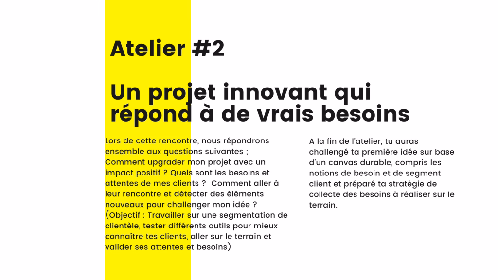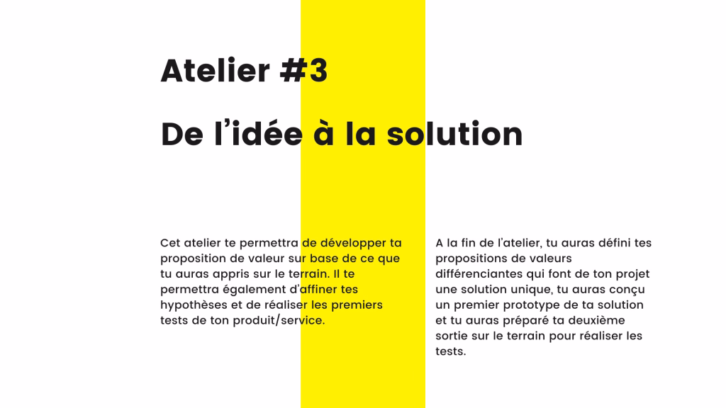 Les ateliers explorent les étapes indispensables afin de créer son entreprise. Ils te permettront de :