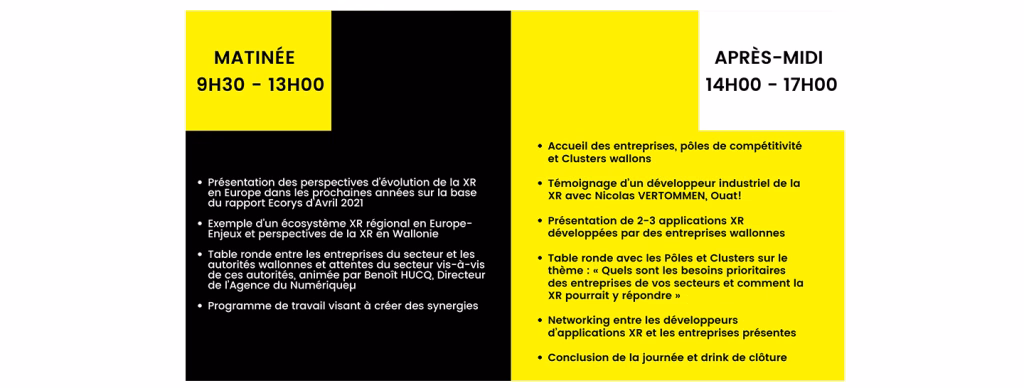 Cet événement d’une journée permet d’identifier les forces et les faiblesses du secteur XR en Wallonie. Il réunit les différentes entreprises et clusters wallons pour les sensibiliser aux opportunités et applications des technologies immersives.